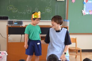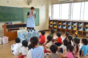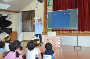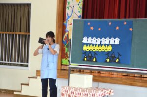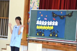 誕生日のお友だちの発表の後は、先生のハロウィンの出し物やお話を、みんな興味津々で聞いていました。