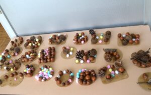 運動会が終わっても、園庭ではバトンを持って走っているお友だちがたくさんいますが、お部屋の中では秋の工作も始まっています。年中さんのお部屋には、かわいいどんぐり工作が飾っていました。