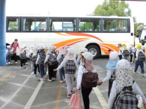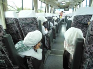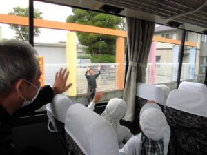 お迎えの大きなバスに乗りこんで、お留守番の先生に「行ってきまーす!」