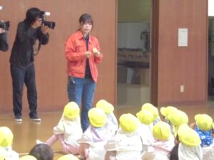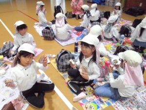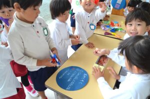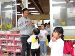 退所式で係の方にお礼を言って、バスで幼稚園に帰りました。「先生、かわいいでしょ!」と帰ってすぐにお留守番してくれていた先生にバッジを見せるお友だち。お家の方にも見せてあげましょうね。