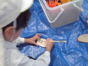 自分で名前も書いて絵が完成すると、先生に胸にバッジをつけてもらって、世界で一つのオリジナルウッドバッジができあがりました。