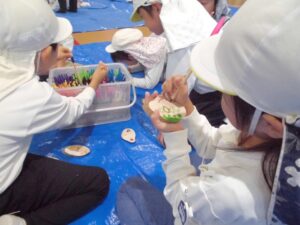 おにぎり弁当をいただいているお友だちの胸には、素敵なバッジがついていました。