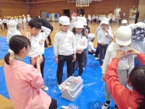 入所式で係の方にごあいさつをして、お話を聞いたあと一つずつ木の板をもらうと「うーん、自然のにおいがする。」「お茶のにおいもするよ。」