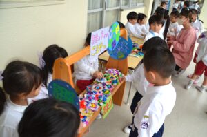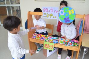 今朝は朝から肌寒く雨模様。そんな中、職員室前には年中のききょう組さんのお店がオープンしていました。