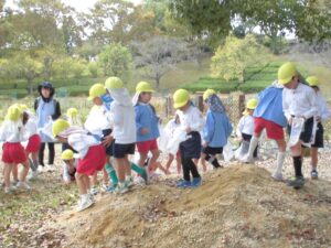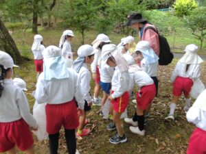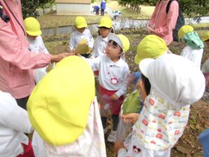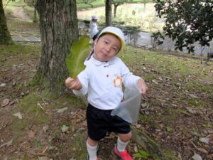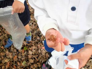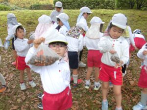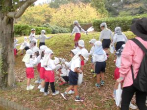 ドングリ拾いの場所につくと「先生、ドングリ帽子がいっぱいついているよ。」「このドングリ、つるつるしてるよ。」と、たくさんドングリを拾っていきました。
