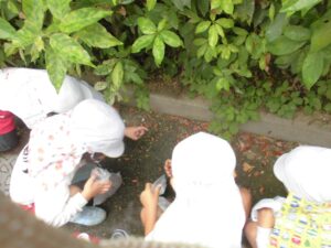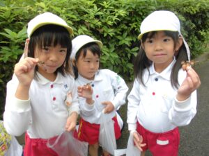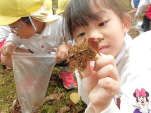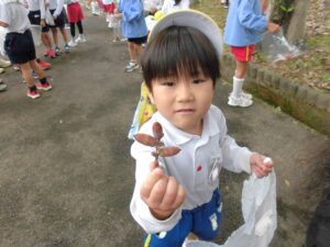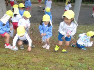 「先生、〇〇くんの帽子にバッタがいるよ。」「カタツムリ、発見。」「セミの抜け殻があったよ。」と生き物にも出会うことができました。