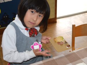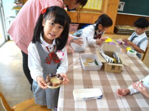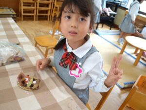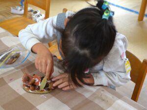 雨間を抜ってバスに戻り、園に帰ってからおにぎりをいただきました。さっそくドングリ飾りを作るお友だちも。