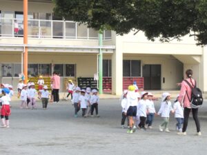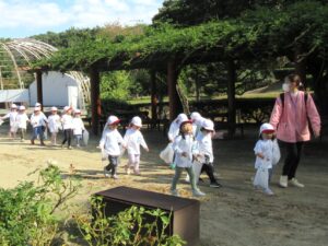 袋にいっぱいおみやげを持って、がんばって歩く年少さん。お天気がよかったので、木々の色や秋の空の飛行機雲がとてもきれいに見えました。