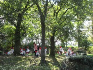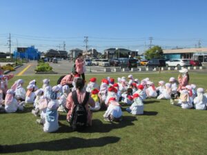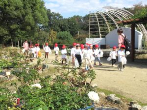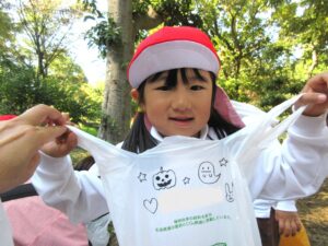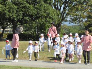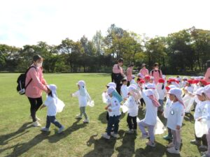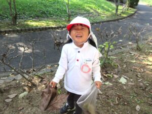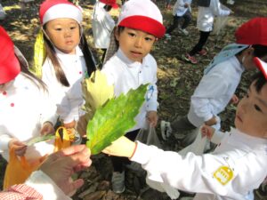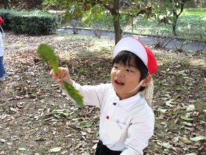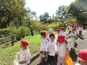 西山公園に到着すると、持ってきた袋をポケットから取り出し、お友だちと手をつないでいろいろな秋を探しに行きました。