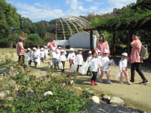 バラ園を通ると、茎にトゲトゲがたくさんついているのを見て「さわると痛そう~。」と顔をしかめたり、「あ!咲いてるのあったよ。」と少しですがピンクや白いバラが咲いているのも見つけました。