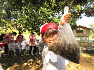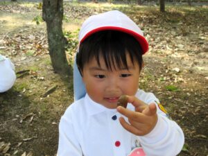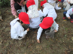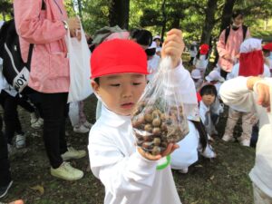 どんぐりの森に着くと、さっそくどんぐりを見つけて拾うこどもたち。