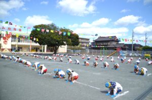 おにぎり弁当の日だった金曜日、運動会の予行練習を行いました。職員室前にあった準備物を見て、登園してきた年少さんは「今日、運動会?」「これ、年中さんが使うんだよね。」と、朝からなんだかみんなワクワクしています。
