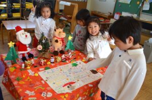 今日は子どもたちが待ちに待ったクリスマス会。「先生、サンタさんに手紙書いてきたよ。ポストに入れていい?」と年長さん。手紙を見せてもらうと、『おもちゃはLaQをたくさんください。』と書いてありました。プレゼント、届くといいですね。