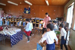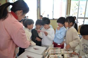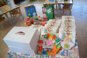 会が終わり保育室に戻ると、いつのまにかサンタさんからのプレゼントが!みんなが作ったサンタバックの中にもお菓子が入っていました。