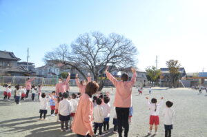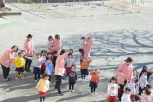 「やったぁ、プレゼントが届いてる!」と大喜び。「まだ近くにいるかも。」と、すぐに園庭やテラスに出て「サンタさん、ありがとう!」と青い空に向かってお礼を言いました。「今、光ったよ。あそこにサンタさんがいるんじゃない?」「そりのあとがついてるよ。ここからお空に行ったのかな。」と、とてもうれしそうで楽しそうでした。