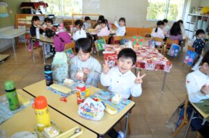 保育室でのクリスマスパーティーでは、みんなでクリスマスケーキをいただきます。クリスマスの曲をバックに、担任の先生も赤いエプロンをつけたりトナカイのメガネをかけたりしてパーティーを盛り上げていました。「メリークリスマス!いただきます!」かわいいケーキを食べるお友だちのお顔はみんなにこにこです。