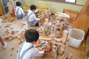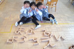 「なになに?」とのぞきに行くと、「じゃーん!すごいでしょ!」積み木を使って『まふみようちえん』ができていました。