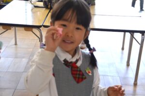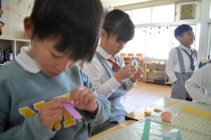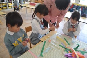 ほし組では、今週年長さんがはまっているラッキースターを作っていました。なかなか難しいのですが、先生から教えてもらって、細い紙を上手に五角形に巻いてぷっくりした星をいくつも作れる子が増えてきました。