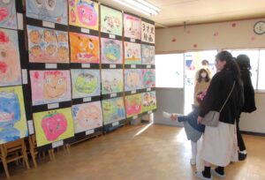 作品展が初めての年少さんは、先生たちが飾ってくれた展示に目をキラキラさせて、お家の方のお話にうなずいたり、一緒に写真を撮ったりと嬉しそうでした。