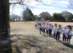 たくさんの春を感じ、幼稚園に戻ってみると、園庭では年少さんや年長さんがシートをひいておにぎり弁当を食べていました。