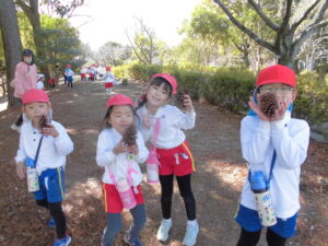 進んでいくと、道に大きな松ぼっくりが!上を見上げるとまだ大きな松ぼっくりをつけた木があり、「まだあるかなぁ。」「あ、あった!」