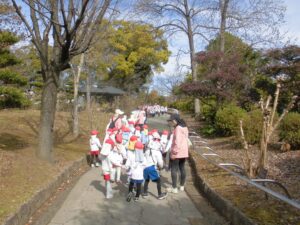 水曜日に園外保育に出かけた年長さんに、梅のお花がとてもきれいだったことを聞いた年中の先生たちは、次の日すぐに下見にでかけ、今日は年中さんが市緑化センターに園外保育に出かけました。