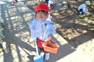 2月も半ばに入りまだまだ寒い日もありますが、風もなく暖かい日の園庭では、防寒用のトレーナーを脱いで元気に遊んでいるお友だちの姿があります。