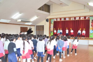 年長さんは、卒園を前に今練習中の『ビリーブ』を元気よく歌い、その後外に出てリレーをしました。