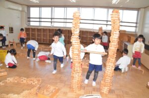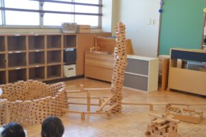 誕生日のお友だちがいなかったクラスでは、部屋いっぱいに積み木遊びを楽しんでいました。
