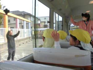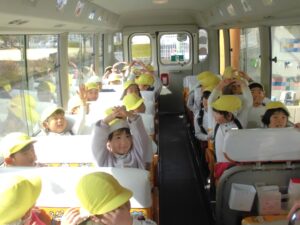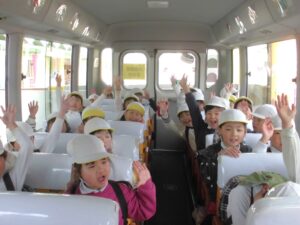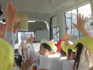 お留守番の先生に「行ってきまーす!」と元気にバスに乗りこみます。