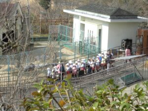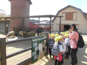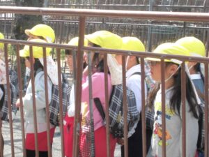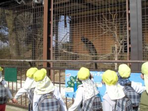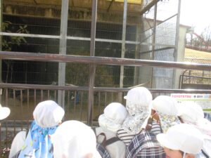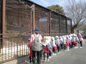 バスの中でも動物クイズなどで盛りあがり、あっという間に鞍ヶ池に到着。さすが年長さん、バスを降りるとすぐにお散歩並びで並んで、クラス毎に動物園を散策しました。