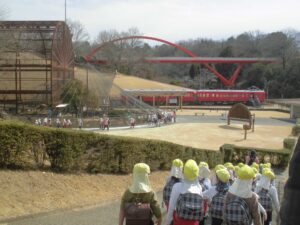 今日の行き先はバスの中で発表。「鞍ヶ池公園の動物園に行って、芝生広場でお弁当を食べます。」「やったー!」