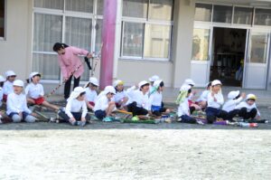 今日の午後、年長さんたちの竹馬大会が開催され、やる気マックスの年長さんたちがクラスごとに一斉にスタートしました。