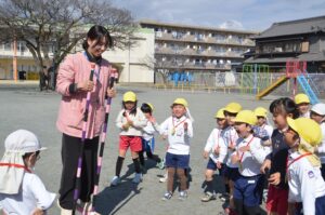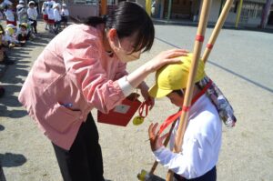 ゴールしたお友だちは先生から竹馬名人の金メダルが授与されました。
