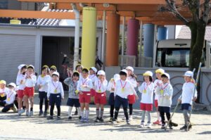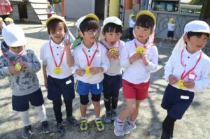 ゴールしたお友だちは先生から竹馬名人の金メダルが授与されました。