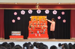 『うれしいひなまつり』のうたが聞こえ始めたころ、遊戯室の舞台の上には7段飾りのおひな様が飾られました。