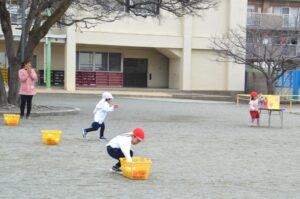 お話を聞いた後は、それぞれ園庭に出て楽しいひな祭りリレーをしました。