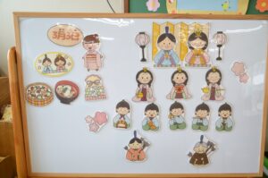 年少さんはクラスの先生にひな飾りのお話を聞きました。「この男の人はだれか知ってる?」「おだいりさま!」みんなひな祭りの歌が大好きなので、お内裏様、三人官女などの名前も次々に出てきます。