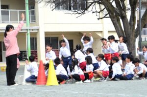 かわいいおひなさまたちが、ハードルを飛び越えたり玉を投げたり、楽しくがんばりました。今日のバトンパスはなかなか大変でした。年長さんが跳び越えているハードルは、卒園記念品として年長児の保護者の皆様からいただいた物です。ありがとうございます。大切に使わせていただきます。