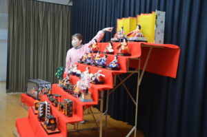『うれしいひなまつり』のうたが聞こえ始めたころ、遊戯室の舞台の上には7段飾りのおひな様が飾られました。