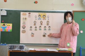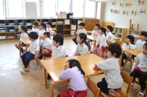 年少さんはクラスの先生にひな飾りのお話を聞きました。「この男の人はだれか知ってる?」「おだいりさま!」みんなひな祭りの歌が大好きなので、お内裏様、三人官女などの名前も次々に出てきます。