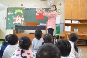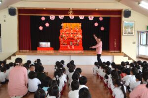 年長さんと年中さんは遊戯室で一緒に、先生からひな祭りの由来やひな飾りの意味などを先生から教えてもらいました。