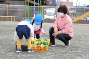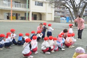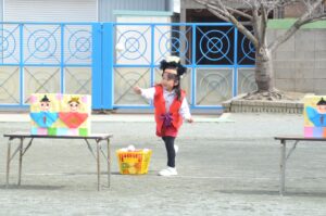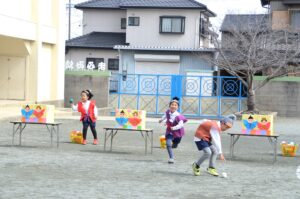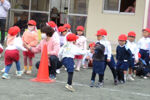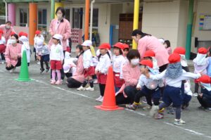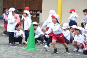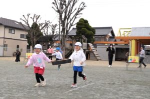 お話を聞いた後は、それぞれ園庭に出て楽しいひな祭りリレーをしました。