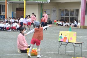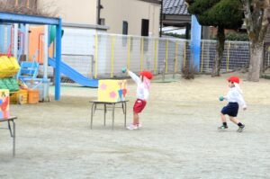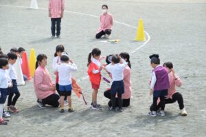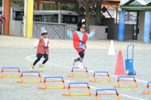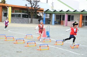 かわいいおひなさまたちが、ハードルを飛び越えたり玉を投げたり、楽しくがんばりました。今日のバトンパスはなかなか大変でした。年長さんが跳び越えているハードルは、卒園記念品として年長児の保護者の皆様からいただいた物です。ありがとうございます。大切に使わせていただきます。