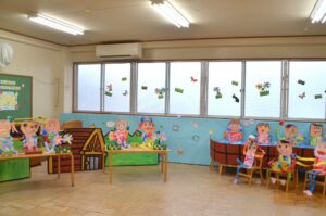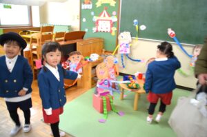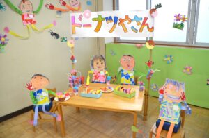 年少さんは『だいすきなようちえん』でお友だちと楽しく遊んだり、お店屋さんごっこやおふろやさんごっこを楽しむ様子を表現しました。