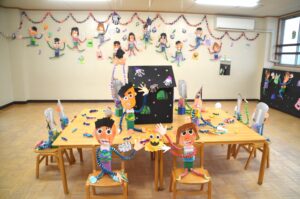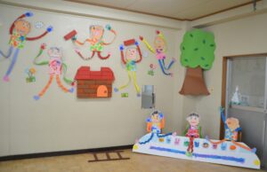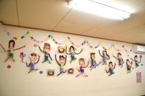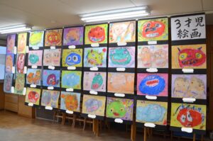 年長さんは遊戯室いっぱいに絵画やコンテ画、中央には表情豊かな紙粘土作品で運動会を再現しました。