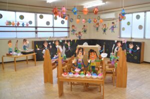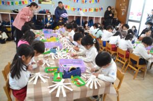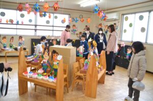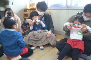どの学年も先生のお話をしっかり聞いて、はさみ・のり・マジックなどを使って、楽しく遊べる玩具を製作しました。