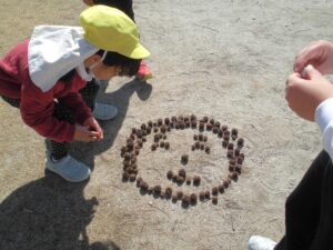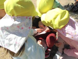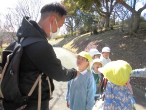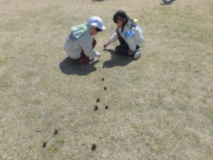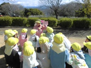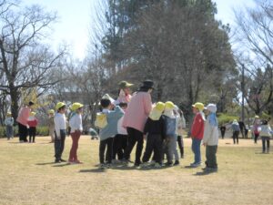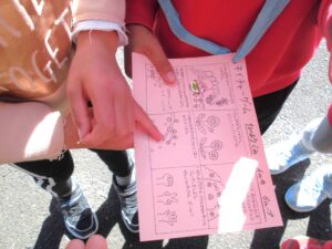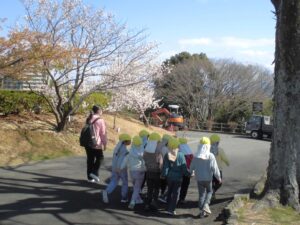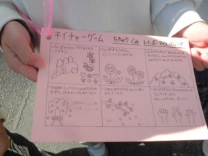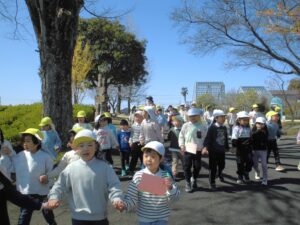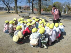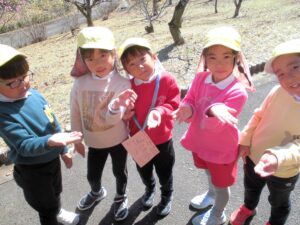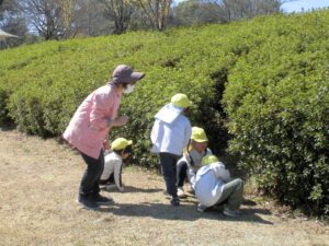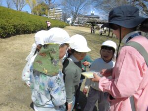 今日の園外保育は『ネイチャーゲーム』です。グループに分かれて、いろんな春を見つけながら問題をクリアしていきます。