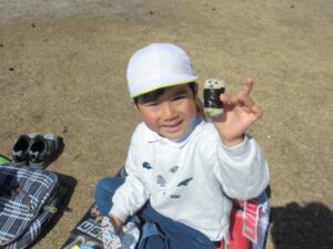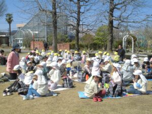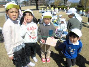 たくさん歩いてからいただいたおにぎり弁当はとってもおいしくて、大きなおにぎりもあっという間になくなっていました。今までおにぎり弁当へのご協力ありがとうございました。「今日のフルーツはいちごだよ」「おにぎりの中はからあげだよ」「○○君、今日のフルーツはなに?」とたくさん楽しい話が飛び交っていました。