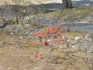 秋に来るといつもどんぐりを拾いに来るところには、赤や白の『ぼけ』の花がかわいらしく咲いていました。